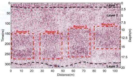 Figure 11, Figure 12, Figure 13 and Figure 14 show that the velocity descends as the depth increases, and the opposite varieties for velocity and relative permittivity are due to (4). In these figures, we can also find that there is a fluctuation at about 250 ns after position of 80 m, which also corresponds to the analysis in which the material and horizontal structure changes at a position of 80 m; the material about 250 ns in Region 3 does not extend to Region 4.