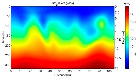 Previous research shows that the relative permittivity of lunar basalt is about 8 [24], so based on the velocity and relative permittivity structure we obtained, we think the region we researched (0–320 ns) is mainly the lunar regolith. The depth coordinates in Figure 9, Figure 10, Figure 11, Figure 12, Figure 13 and Figure 14 are determined using average root-mean-square velocity of all traces; so the thickness of the lunar regolith is more than 20 m. In addition, the TiO2 and FeO content in the bottom of Figure 14 is about 17.5 wt%, which is close to the shallow lava flow observed in [3,4], so we speculate that the surface of the basalt is within 25 m in depth.