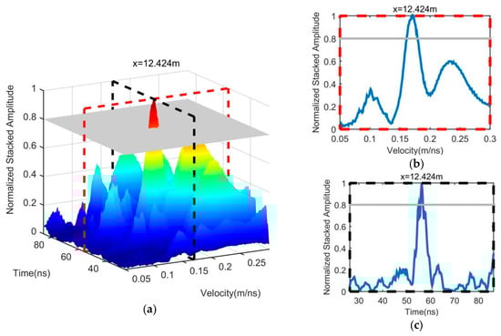 In this section, the estimation errors of two-way reflected time and velocity are discussed. Take the first slice in Figure 8b for instance, a 3D surface plot can be computed, which is shown in Figure 15a. The maximum value in this figure indicates the two-way reflected time and velocity of this hyperbola. However, some error will generate from the noise interference and incomplete hyperbola; the correct point is probably in a region; a flat at an amplitude of 0.8 is selected to split out this region. Two profiles, which are the red rectangle and black rectangle in Figure 15, are extracted out to compute the error intervals of velocity and reflected time, respectively. The two intersections of the blue curve and gray line around the maximum value are selected to compose the error limit.