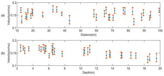 Distributions of velocities and error ranges. (a) Velocities and error ranges with distance. (b) Velocities and error ranges with depth. The triangular points represent the error ranges; the blue dots represent the estimated velocities.