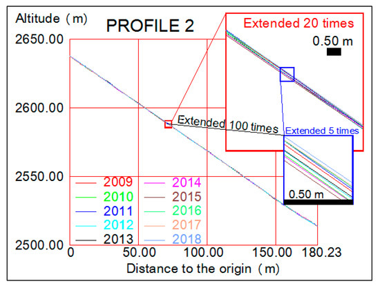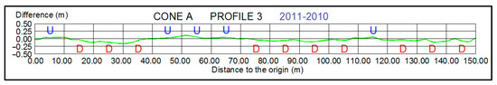 - Figure 5 illustrates sequences of over five annual periods with continuous values of thickening “U” (purple lines) or thinning “D” (yellow lines). Sequence D (yellow line) in Figure 6 shows that the thinning at 80 and 90 m from the origin of the profile in the 2010–2009 period is found 10 m further back (now at 70–80 m) in the following period (2011–10). This process continues until 2015–2014 for a distance interval of 30–40 m. The wavy profile may be interpreted as creep on the surface, producing thickening and leaving thinning up and down. This process takes place continuously until the profile becomes stable (Figure 15).