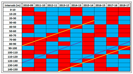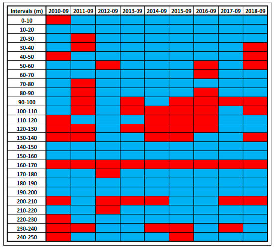 - There are not more than three consecutive periods (columns) of accumulation or loss for the same distance interval. This corroborates the observation made in the previous point, which is that there is no continuity over time of thickening or thinning in certain areas;