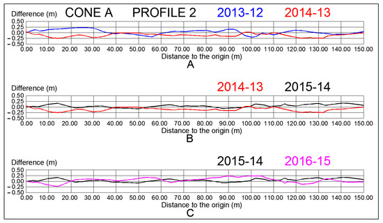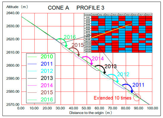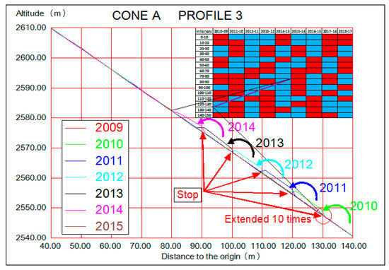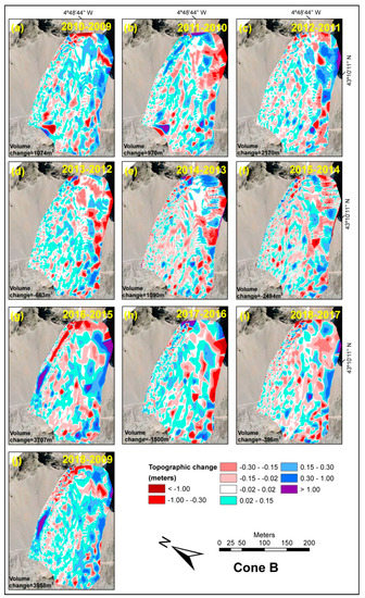 - The wavy profile implies variations from one year to the next at the same point (Figure 5). The line of maximum slope sometimes shows alternative thinning and thickening areas (Figure 7). The periods of annual thickening and thinning show a minimum of five periods of each (accumulation and loss) for the total of nine periods studied (2010–2009, …, 2018–2017) (Figure 6). These facts show a wave behavior on the surface of the cones, particularly in Cone B;