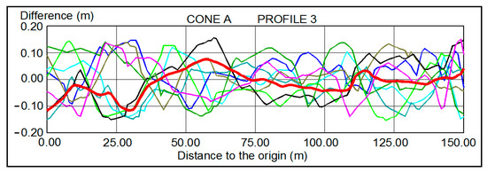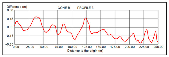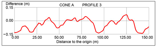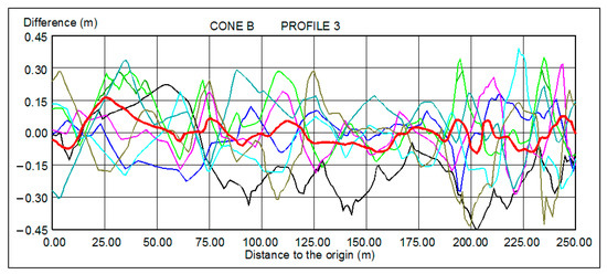 - The prediction of profile 3 of Cone B is less precise than that obtained in profile 3 of Cone A. In this case, the method is sensitive to some exceptional event (displacement of large blocks) in the distal portion, as can be seen in Figure 11. This lack of precision may also be due to the greater difference between the curves (prediction and measured) in profile 3 of Cone B (Figure 11) than in profile 3 of Cone A (Figure 9). Figure 10 (Cone A) shows differences of +7 cm and −15 cm and Figure 12 (Cone B) differences of +16 cm and −27 cm;