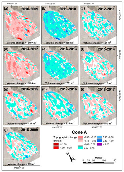 - Intervals from −0.02 m to −0.15 m and from 0.02 m to 0.15 m; the value of 0.15 m is the maximum difference generated in the DEMs on the same cone and in the same observation survey;