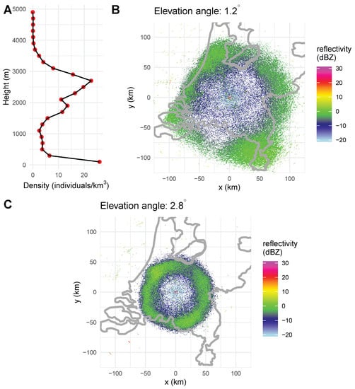Figure 1 illustrates the challenges arising when trying to interpret a two-dimensional representation of migration density from one elevation scan when migration takes place at a high altitude. On this night, bird migration was concentrated in a layer between 2 and 3 km a.s.l. (see the vertical profile in Figure 1A). Elevation scans of such layering events typically show a donut-shaped reflectivity pattern (Figure 1B,C), with high reflectivities appearing at locations where the radar beam intersects with the high-altitude migration layer. This donut-shaped pattern poorly represents the spatial distribution in the number of migrants aloft.