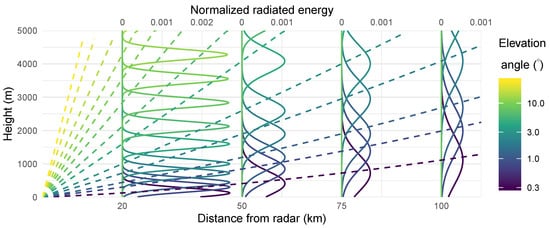 is plotted in Figure 2 for a volume scan of the Herwijnen radar in the Netherlands, with different elevations indicated by different colors, and the radiated energy for four different ranges (20 km, 50 km, 75 km, and 100 km). The profiles of radiated energy broaden with range, and the overlap between the lower beams is considerable for heights below 5 km at longer ranges.