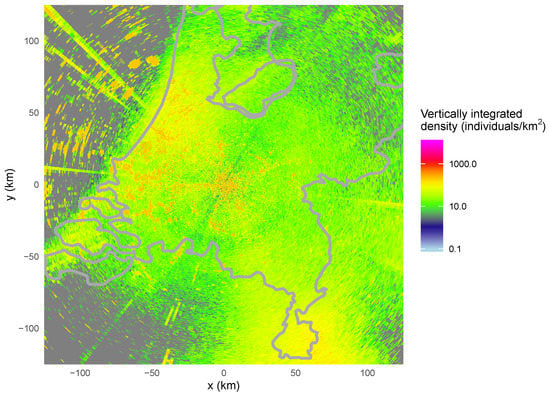 The effect of vertical integration was evident from the result that the donut shape visible in individual scans (Figure 1B,C) was no longer visible in the VID product (Figure 3). The spatial VID estimate highlighted a region of high migratory density in the southeast of the Netherlands that was only visible in a limited number of scans as for most scans, the radar beam was either too low or too high (e.g., Figure 1C).