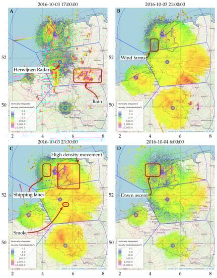 Example of a vertically integrated bird () density composite, showing a map of the estimated number of birds for different time slices through the night of 3–4 October 2016 over the Netherlands and Belgium. (Panel A) is just before sunset (17:00); (B) shows increased migration intensity at the beginning of the night (21:00); (C) shows continued migration during the night (23:30); and (D) is just after sunrise (6:00). Annotations were made based on combining inspection of the animations with online resources, such as historical weather reports and news items.
