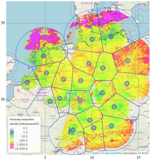 A second case study is presented for a larger region that includes Germany. We generated a similar visualization to the first case study, for the night of 18 October 2017 at 21:00 that included in total 20 different radars. Exploration of the German data revealed that strong filtering was applied to the processed reflectivity data (quantity DBZH). After this filtering, hardly any biological signal was retained especially further away from the radar. Therefore, we opted to use the total unfiltered reflectivity, quantity: TH; see [31] and removed the part of the signal that was due to static objects as determined by a Doppler notch filter (quantity CCORH; [27]).
