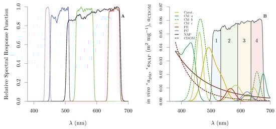 The superposition of the defined regions with the spectral mass specific in vivo absorption coefficient of pigment groups, , the mass specific absorption coefficient of Non-Algal Particles (NAP), , and a relative magnitude of absorption coefficient by chromophoric dissolved organic matter (CDOM), , is presented in Figure 1B. It shows that Region 1 is in the green gap of chlorophyll (Chl) pigments, dominated by carotenoids, while Region 3 includes the PC peak, the smaller red Chl a absorption peak and Chl c. It can be expected that Region 3 will present larger independent variation from Regions 2 (green) and 4 (red) than Region 1, in particular for turbid inland waters, where different phytoplankton groups may have strong presence of accessory photosynthetic pigments. Region 1 is not strongly affected by pigments but will be correlated with signals from adjacent bands due to particle scattering in addition to carotenoids, inorganic and organic absorption (particulate and dissolved). If this correlation is sufficiently high, signal from the turquoise region can be accounted for within acceptable errors, allowing for robust isolation of the orange signal.