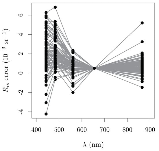 The error propagation of spectrally correlated error caused by imperfect atmospheric compensation (AC) [34] was also evaluated. The AC additive error is dependent on local atmospheric and surface conditions, illumination and observation geometry, availability of bands and the specific algorithm used for AC. Therefore, for a realistic simulation of AC error propagation, measured AC errors for OLI processed with the ACOLITE AC code [6,9,35,36] were used (Figure 2). Those AC errors were taken from Vanhellemont [36], calculated by contrasting 98 matchups between OLI-ACOLITE estimated with in situ observations from 14 coastal and 2 lacustrine AERONET-OC sites [37], the majority of which are located in the US and Europe. OLI scenes were processed with the Dark Spectrum Fitting (DSF) algorithm and compared against Level 2.0 AERONET-OC observations. ACOLITE was chosen to implement AC for the Pan band and provide an application demonstration (described below). The error for OLI-ACOLITE in the sites studied by Vanhellemont [36] ranged from −0.0054 sr to 0.0046 sr, with a median of 0.0005 sr. Those additive errors represent 0.14% to 759.7% of the red band signal of our in situ data, with a median of 7.47%. Since the Pan band AC error is not available, it was calculated as the average of the red and green band errors. The matchups between OLI-ACOLITE and AERONET-OC are provided in the Supplementary Materials.
