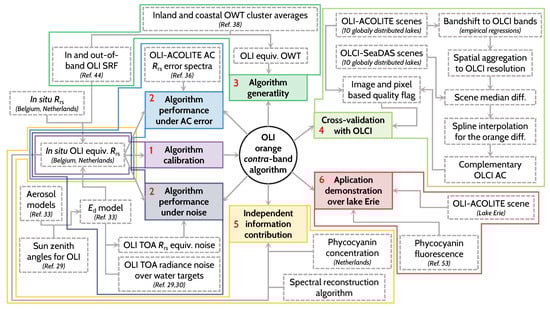 The presence of new information in the orange band, that is, information not already present in the correlation structure of the adjacent MS bands, was evaluated by comparing the residuals of the contra-band algorithm with those of an empirical spectral reconstruction based on multilinear regression to the green and red MS bands (). This empirical algorithm does not include a Pan band and represents an explicit assumption that all information in the orange region is contained in the adjacent spectral regions. Only the adjacent green and red MS bands were included, as would be recommended in real applications to prevent propagation of AC errors in the blue bands and adjacency effects in the NIR. The residuals of both algorithms were then regressed against the PC to Chl a ratio to explore possible bias. Finally, the potential application of the orange contra-band for water quality studies was demonstrated for an OLI scene acquired in western Lake Erie. A schematic representation of the analysis provided in the main text is presented in Figure 3. Statistics of performance were the coefficient of determination (), the Root Mean Squared Error (RMSE), the Mean Absolute Percentage Error (MAPE) and the bias, calculated as the mean percentage error. All analysis were performed in R version 3.3.3 [41].