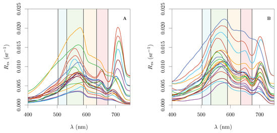 Sample spectra from the in situ dataset: (A) Belgian lakes; and (B) Dutch lakes. The defined Pan regions are shown in the background.