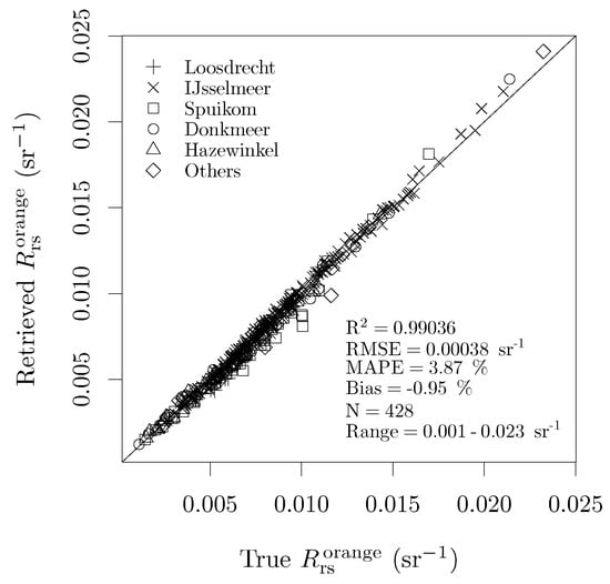 Evaluation of retrieval with the orange contra-band from OLI Pan and MS bands using Equation (5) with in situ data.