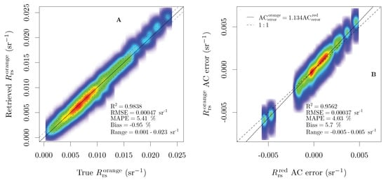 Error propagation to the orange contra-band with simulated OLI data based on in situ data: (A) uncertainty arising from spectrally independent random sensor noise; and (B) uncertainty arising from AC error propagated into the orange contra-band as a function of the AC error in the red MS band.