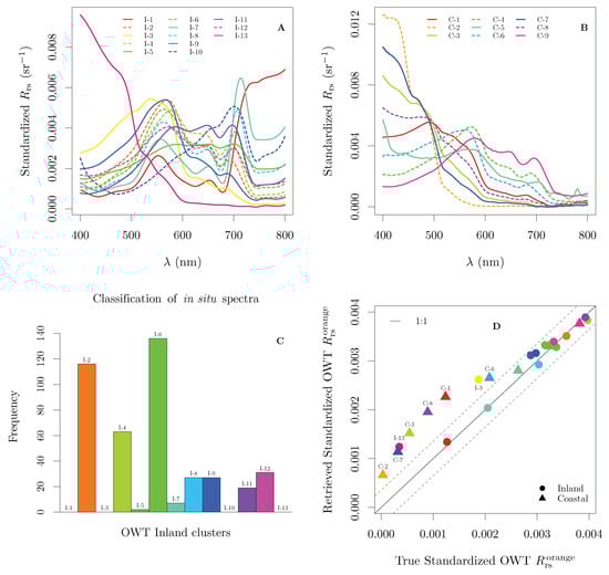 Analysis of generality of Equation (5) to spectral shapes in the Optical Water Types: (A) the average spectra of the thirteen clusters of inland OWT; (B) the average spectra of the nine clusters of coastal OWT; (C) classification of in situ spectra used in this study with the inland OWT clusters; and (D) retrieval of orange contra-band for the average spectra of the OWT, with outliers indicated. Those outliers represent relatively clear waters (average Secchi disk depth > 6 m and average Chl a < 1.6 mg m). OWT reproduced from Spyrakos et al. [38].