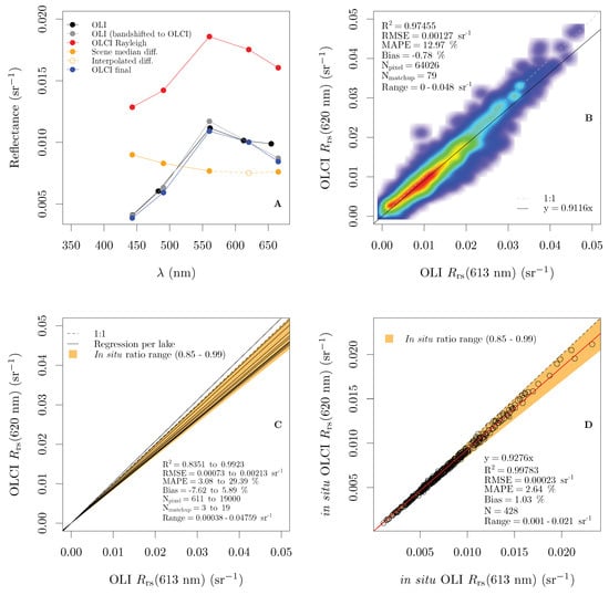 Cross-validation of the OLI orange contra-band with the OLCI orange band: (A) illustration of the AC process for OLCI; (B) OLI to OLCI comparison for all 81 matchups; (C) OLI to OLCI comparison per lake; and (D) OLI to OLCI comparison based on in situ data.