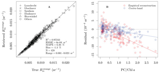 Analysis of the presence of independent information in the orange contra-band: (A) retrieval of orange reflectance performance with an empirical spectral reconstruction algorithm, using the green and red MS bands; and (B) correlation between residuals of the empirical reconstruction and contra-band algorithms against the PC to Chl a ratio.
