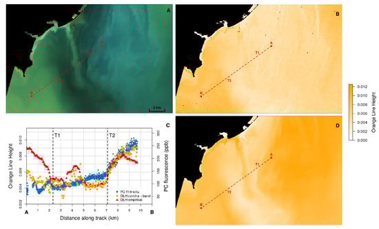 Application of the orange contra-band to calculate the OLH in west Lake Erie. Sampling transect starts in the Detroit River plume at Point A and ends at Point B in the Maumee Bay, passing through two transition points T1 and T2 [53]: (A) true color composite; (B) OLH calculated with the contra-band algorithm; (C) spatial gradient along the transect line for PC fluorescence and OLH calculated with the contra-band and empirical spectral reconstruction algorithms; and (D) OLH calculated with the empirical spectral reconstruction algorithm that assumes all information in the orange is contained in the green and red MS bands. (C) is adapted from Figure 11A in Moore et al. [53].