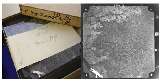 Data for the central Congo Basin region, surrounding Kisangani, were collected in several flights during the dry season of 1958 and 1959 (from 8/01/1958 to 20/02/1958 and from 28/12/1958 to 9/01/1959, respectively; see Appendix A Figure A1 and Figure A2 and Appendix A Table A1) to generate topographic maps of the area, supervised by the “Institut Géographique du Congo Belge” in Kinshasa, DR Congo (then Léopoldville). Black-and-White panchromatic images (0.4–0.9 m) were gathered along flight paths running mostly from west to east, between 09:00 and 11:00 local time. Along a flight path, continuous images were taken using a Wild Heerburgg RC5a (currently Leica Geosystems) with an Aviogon lens assembly (114.83 mm/f 5.6, with a 90 view angle) resulting in square photo negatives of 180 by 180 mm. Flights were flown at an average absolute altitude of ~5200 m above sea level, covering roughly 18,530 km2 at an approximate scale of 1/40,000. The use of the integrated autograph system ensured timely acquisition of pictures with a precise overlap (~1/3) between images. This large overlap between images together with flight parameters would allow post-processing using stereographs to create accurate topographic maps. Original data from this campaign are stored in the Royal Museum for Central Africa in Tervuren, Belgium (Figure 1, Appendix A Figure A3).