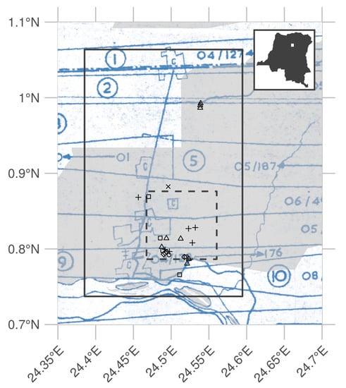 Overview of the historical flight paths during aerial photo acquisition and ancillary data used in this study: The bounding box of the orthomosaic data presented in this study is shown as a rectangle (23 × 36 km). The outline of a recent high-resolution Geo-Eye panchromatic image is shown as a dashed dark grey rectangle (10 × 10 km). The location of various permanent sampling plots are shown as x, +, and open squares and triangles for the mixed, mono-dominant, and edge plots, respectively. The grey polygon delineates the current-day Yangambi Man and Biosphere reserve. The inset, top right, situates the greater Yangabmi region (white rectangle) within the DR Congo. The full flight plan and details are shown in Appendix A Figure A1 and Figure A2.
