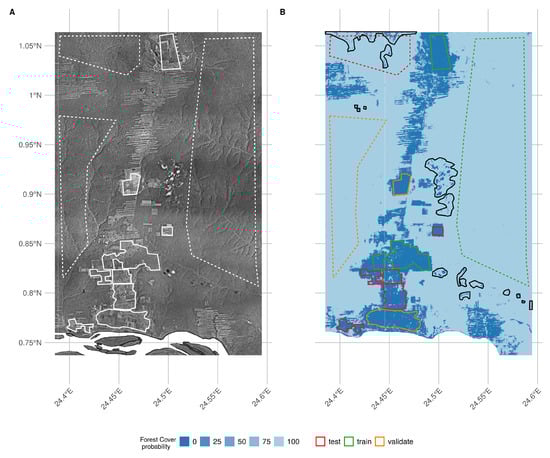 Overview of the final orthomosaic of the greater Yangambi region (A) as well as the forest cover classification uncertainty (B) used to generate the final land cover map (see Figure 5): Homogeneous polygons used in the generation of the synthetic landscape for convolutional neural network training, testing, and validation are marked as dashed and full lines for forest and non-forest regions, respectively. Training, testing, and validation regions are denoted in panel B in green, red, and orange, respectivelly. Black polygon outlines denote cloud and image stitch line regions which were manually excluded from analysis but retained in calculation of validation statistics (see Table 2).