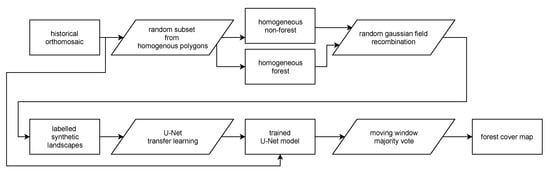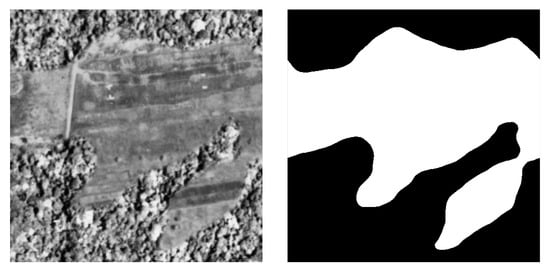 We automatically delineated all natural forest in the historical data, thus excluding tree plantations, thinned or deteriorated forest stands which showed visible canopy cover loss, fields, and buildings. We used the Unet Convolutional Neural Net (CNN, Ronneberger et al. []) architecture implemented in Keras [] with an efficientnetb3 preprocessing backbone [] running on TensorFlow [] to train a binary classifier (i.e., forest or non-forested). Training data were collected from the orthomosaic by randomly selecting 513-pixel square tiles from locations within homogeneous forested or non-forested polygons in the historical orthomosaic (Figure 3). Separate polygons were selected for training, testing, and validation purposes. Validation polygons were sampled 300 times, while both testing and validation polygons were sampled at 100 random locations. Tiles extracted from locations close to the polygon border at times contained mixed cover types. Tiles with mixed cover types were removed from the list of source tiles (Table 1). Homogeneous source tiles were combined in synthetic landscapes using a random Gaussian field-based binary mask (Figure 4). We generated 5000 synthetic landscapes (balancing forest and non-forest classes) for training, while 500 landscapes were generated for both the validation and the testing datasets for a total of 6000 synthetic landscapes. In order to limit stitch line misclassifications, along the seams of mosaicked images, we created synthetic landscapes with different forest tiles to mimick forest texture transitions. We applied this technique to 10% of the generated synthetic landscapes (across training, validation, and testing data).