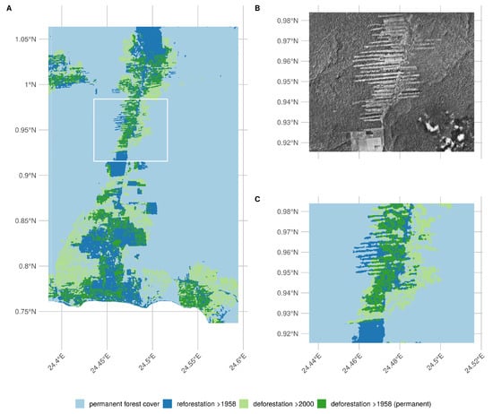 To map long-term LULCC in the Yangambi region, we used the contemporary Global Forest Change version 1.6 (GFC, tile 10N-020E) (lossyear) map data []. Using the GFC data, we calculated the latest state of the forest with respect to the conditions at the start of 1958, 60 years earlier. In our analysis, we only included GFC pixels which recorded no forest loss throughout the whole 2000–2018 period. Forest loss in the context of GFC is defined as “a stand-replacement disturbance or a change from a forest to non-forest state”. As such, locations which would see reforestation or deforestation between 2000 and 2018 would be marked as non-forest (i.e., disturbed). As the resolution of the historical forest classification exceeds that of the GFC map, we downsampled our historical forest cover data to 30 m GFC resolution using a nearest neighbour approach. We masked out all water bodies using the Global Forest Change survey data mask layer and limited the analysis to the right bank of the Congo river. We provide summary statistics of historical and contemporary deforestation and reforestation. We map permanent deforestation after 1958, reforestation after 1958, recent deforestation, and long-term (stable) forest cover. All references to changes over time in the context of our analysis explicitly compare the historical and contemporary periods from hereon forth.