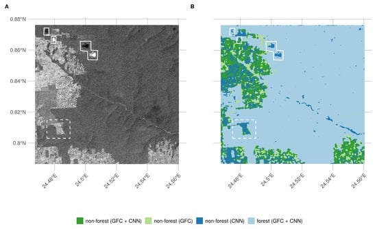 Convolutional Neural Network (CNN)-based forest cover classification results (B) as run on a recent (2011) Geo-Eye panchromatic image (A): We show the difference between the convolutional neural network-based classification and a recent Landsat-based forest cover map by Hansen et al. 2013. Full white outlines denote cloud contamination; the dashed rectangle shows a location where the CNN outperforms the Landsat based forest classification.