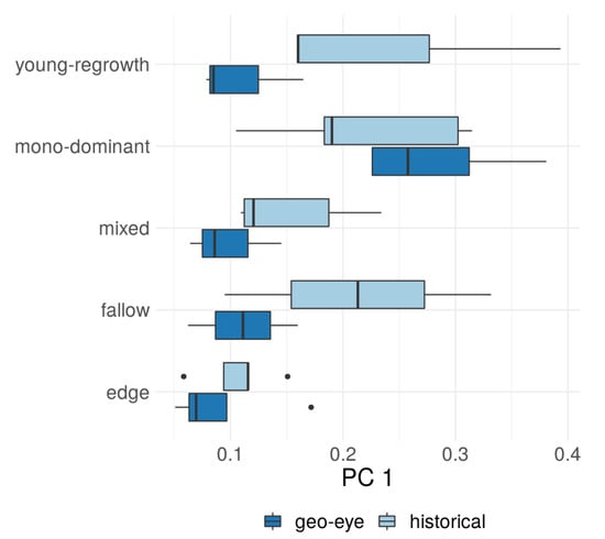 Boxplots comparing the first principal component (PC1) of a site-based Fourier Transform Textural Ordination (FOTO) analysis across different forest types for both contemporary (Geo-Eye) and historical orthomosaic data.