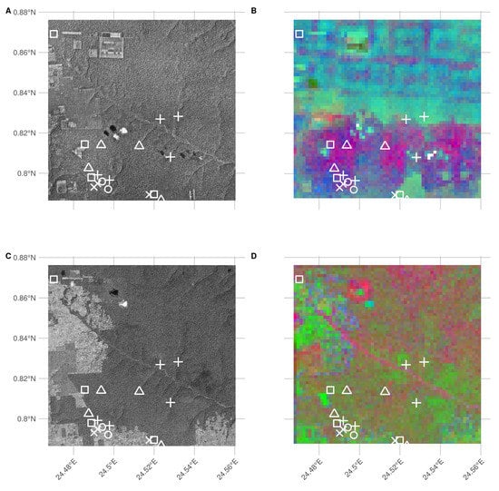 Black and white overview images and red-green-blue (RGB) visualizations of the first three principal components of scene-wide FOTO texture analysis of historical (A,B) and current (Geo-Eye, C,D) imagery: Current permanent sampling plots of mono-dominant, mixed, fallow, and young (edge) forest plots are marked with open triangles, open circles, open squares, and crosses, respectively.