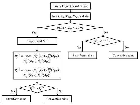 Figure 5 shows a flowchart classifying stratiform and convective rains through the trapezoidal MF using S-POL radar data from the Yongin site. The radar classification with the trapezoidal MF method can be performed after obtaining the values of the four limits from the Parsivel data. First, the stratiform rains can be identified when 30.02 dBZ, whereas the convective rains can be verified if 39.96 dBZ. According to Hwang [81], the summation of inputs for the fuzzy logic method is advantageous, because other inputs can compensate, particularly for the cases that have weak characteristics in one input. Hence, this summation of inputs is applied in the current study for the intercept of between 30.02 and 39.96 dBZ (Figure 5). The stratiform rains can be identified if (mean value of the input summation for stratiform rains) is larger than (mean value of the input summation for convective rains); otherwise, the classification is convective rain. Details of the trapezoidal MF classification method are shown in Figure 5.