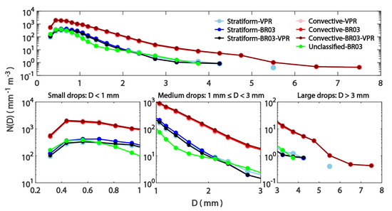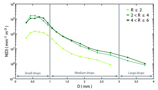 For stratiform rains, the BR03-VPR method showed that the average drop size spectra increased with increasing R across small and medium drops. Furthermore, for medium drops, the VPR method of the stratiform rains showed that average DSDs increased with increasing R. However, for the convective rains, the BR03 method showed that the average drop size spectra increased with increasing R across small and medium drops. In addition, all the methods of the convective rains indicated that the average DSDs increased with increasing R across all the diameter bins for medium drops, except for the VPR method. Figure 8 presents the size distribution of the unclassified rains. The figure demonstrates the average DSDs according to three classes ( 2, 2 6, and 4 6) for the unclassified rains according to the BR03 method over small, medium, and large drops. The number concentration increased with increasing R only when the diameter in the ranges D ≥ 0.69 mm.