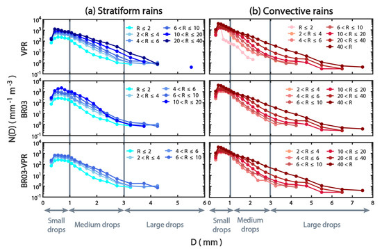 Figure 7 shows the average DSDs of the different R classes for stratiform and convective rains. The number of rainfall categories for the stratiform rains (six classes: 2 mm h, 2 4 mm h, 4 6 mm h, 6 10 mm h, 10 20 mm h, and 20 40 mm h) was lower than that for the convective rains (seven classes: 2 mm h, 2 4 mm h, 4 6 mm h, 6 10 mm h, 10 20 mm h, 20 40 mm h, and 40 mm h). The convective rains had higher R ( 40 mm h) than the stratiform rains. Moreover, the R values for all the stratiform rains were found to be in the lowest category ( 2 mm h), as shown in Figure 7a. However, only the VPR method existed for the convective rains (Figure 7b). It was expected that the R of the stratiform rains would be lower than that of the convective rains (e.g., [14,82]).