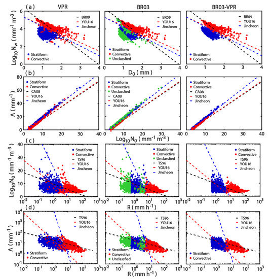 Figure 9a shows scatter plots of the measurements of against along with the classification lines proposed by BR09, YOU16, and the new separation line derived from the Jincheon site. The values of () for stratiform rains of all methods ranged from 0.72 mm (1.97 mm m) to 1.99 mm (5.10 mm m). The corresponding ranges for all convective rains were 0.64 mm (2.41 mm m) to 3.20 mm (5.16 mm m). However, the classification lines of BR09 and YOU16 failed to separate the stratiform and convective rains correctly for all three methods (VPR, BR03, and BR03-VPR). The YOU16 classification line seems to provide a better separation than BR09 (Table 3), which may be because the rainfall types are from the same weather systems. Table 3 shows the percentages of misclassification of both rainfall types based on the , , , and separation lines.