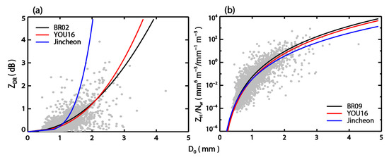 where r is the axis ratio (; a and b are the major and minor axes of the spheroid, respectively) and D is the equivolumetric spherical diameter in mm [64]. The goal of this method is to retrieve the DSD parameters from , , and [23,64,67]. The advantage of the method is that the three parameters of the normalized gamma DSD can be retrieved independently [67]. However, the errors in the modeled DSD and estimations restrict the application of the method to cases with high R values [67], and thus the retrievals from , , and may be dependent [68].