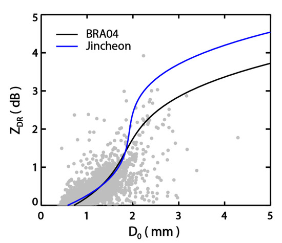 Equation (13) was proposed by Beard and Chuang [55] for the equilibrium raindrop axis ratio derived from a numerical model. Later, Andsager et al. [56] found that raindrop shapes with a diameter between 1.1 and 4.4 mm in turbulent flow are better explained by Equation (14). Bringi et al. [15] proposed the combined drop shape assumption using Equations (13) and (14) to better represent rain drops in nature. You and Lee [53] found that combining Equation (13) for raindrops smaller than 1.1 mm and larger than 4.4 mm with Equation (14) for the raindrop diameter between 1.1 and 4.4 mm gave more accurate rainfall estimates in Korea, compared with other raindrop shape assumptions. Other variables in the T-matrix calculations include the temperature, frequency and distribution of the canting angles of rain drops. The temperature is assumed to be 20 C, the frequency is 2.87 GHz and the distribution of their canting angles is Gaussian with a mean of 0 and a standard deviation of 7, as determined by Huang et al. [57]. The T-matrix scattering method [58,59] was used to compute the polarimetric variables and relationships between and , and and , using DSDs measured by a Parsivel disdrometer to determine the reference classification method for rainfall types using radar variables.