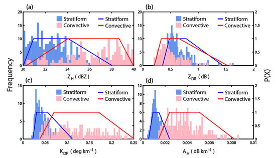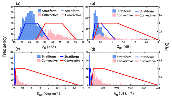 The fuzzy logic approach in the current study is based on the observations of , , , and , which are highly sensitive to droplet shape, size, orientation, and composition [34,77,78,79,80], for stratiform and convective rain classification. Hence, can be defined as