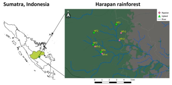 Location of the four upland and four riparian study plots in Jambi Province in the lowlands of Sumatra, Indonesia.
