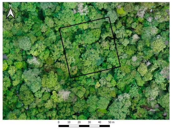 An average of 209 images per plot were used to build 3D point clouds and derive orthomosaics. Images of insufficient quality (e.g., blurry images) were removed from the datasets. Each image was aligned and geo-referenced with the drone GPS logs using Agisoft Photoscan Professional 1.2.6 [41]. The drone-based GPS measurements provide higher accuracy than ground-based measurements under the dense canopies; we used more than 200 GPS points at each study plot from the geo-tagged images for georeferencing the whole plot map. The workflow included building dense point clouds, creating a mesh from the clouds, generating digital elevation models (DEM) and then generating the orthomosaics. 3D point clouds were generated using the Structure from Motion (SfM) technique [17,18] in Agisoft Photoscan Professional 1.2.6 software. An example of such an orthomosaic is depicted in Figure 2.