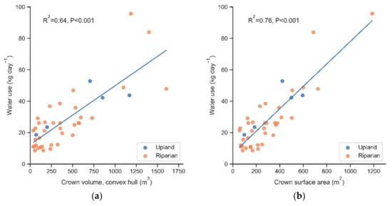 Tree water use vs. (a) crown volume and (b) crown surface area. Water use rates were estimated with sap flux techniques; 42 sap flux sample trees could be clearly identified in the aerial images (pooled data from upland and riparian plots). Crown metrics were derived from simultaneously carried out drone-based surveys.