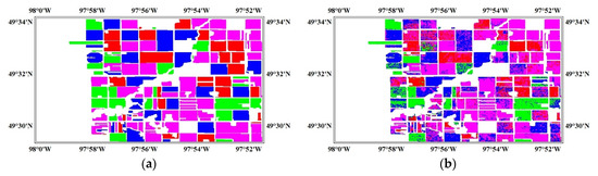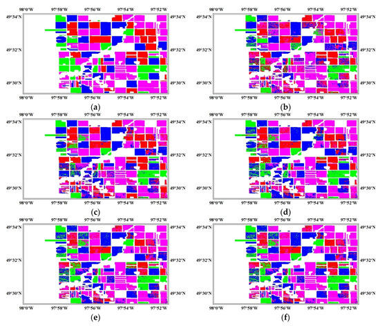 Because the time intervals are very short, the categories of objects in the three images have not changed, so the correlation between any two images is very strong, and the difficulty of DA is relatively low. Although it seems that DA has no practical application significance for this dataset, it can still help us test DA effects under ideal conditions. Moreover, since most of the crops in this area were in their growing stage, there are indeed some backscattering differences of the same category in different times. The classification maps are generated by the use of different methods, as shown in Figure 2, Figure 3, Figure 4, Figure 5, Figure 6 and Figure 7.
