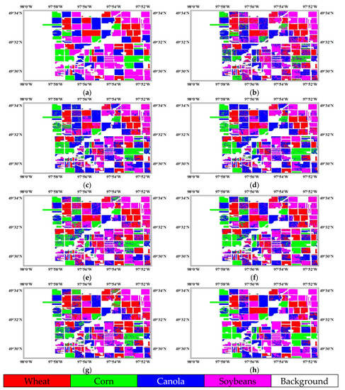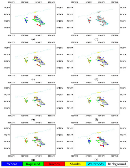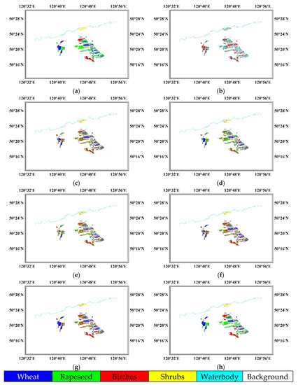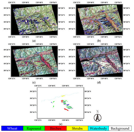 The Radarsat-2 dataset includes four PolSAR images. The acquisition times are 2012-09-01, 2013-06-16, 2013-07-10 and 2013-08-03, respectively recorded as Domain A, Domain B, Domain C and Domain D in this subsection. A multi-look operation has been carried out to suppress speckle noises and reduce image sizes. After geocoding, the sizes are all pixels. Four PauliRGB images are shown in Figure 8a–d, and the corresponding ground truth maps are displayed in Figure 8e, Figure 9a, Figure 10a, Figure 11a. There are five main types of ground objects in the imaging area: wheat, rapeseed, birches, shrubs and waterbody. As two kinds of crops, wheat and rapeseed both own different scattering characteristics in different growth stages. Birches and shrubs are also able to vary with seasons, local incidence angles and other factors. All these conditions have a bad impact on cross-domain learning. Moreover, the spatial distribution of crops has also changed from 2012 to 2013. Therefore, this dataset can be used as a typical verification data to test the performance of DA algorithms.