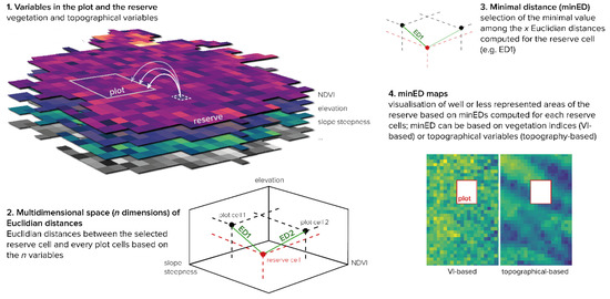 Overview of the steps for minimal Euclidian distances (minED) calculation based on vegetation indices (VIs) and topographical variables. This is a modification of regular Euclidian distance (ED) computation in which there is more than one reference cell (the plot contains x cells), where only the minimal value is kept. Steps leading to minED maps are described here: After grouping several data layers (step 1), Euclidian distances were computed between each plot cell and each reserve cell based on variable values standardized on a 0–1 scale (step 2). Then, step 3 involved keeping only the minimal Euclidian distance value computed for each reserve cell (among the n values, where n = the number of cells within the plot), on the basis that there was one plot cell that offered the best representation of the considered reserve cell. Finally, step 4 led to the construction of georeferenced rasters with minED values computed either with vegetation indices or topographical variables. MinEDs show how well the reserve is represented based on the inserted variables.