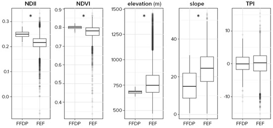 The difference between the FEF and FFDP was significant for both VIs as well as slope and elevation (Figure 3). Vegetation cover was greater in the FFDP, with both mean NDII and NDVI being significantly higher for pixels with the FFDP boundary (NDII = 0.25 ± 0.01, NDVI = 0.80 ± 0.009) than the greater FEF (NDII = 0.21 ± 0.03 and NDVI = 0.78 ± 0.033). Mean elevation and slope steepness were significantly higher in the reserve, whereas there was no difference for TPI between the FEF and FFDP. The proportion of the cells with different slope aspects were also significantly different between the FFDP and the FEF (χ2 = 41.86, df = 7, p < 0.001, Figure S3), with a greater proportion of NW-N slope aspects and a lower proportion of SW-S aspect in the FFDP than in the FEF. The range of values represented by the FFDP in relation to the FEF was greater than 66% for the TPI, 58% for slope steepness, but only 10% for elevation, 9% for NDVI, and 23% for NDII. The interquartile range (IQR i.e., Q1–Q3) of the FFDP represented only 6.3% of the NDVI, 0% of the NDII, and 9.5% of the elevation, but 33.7% (slope steepness) and 81.1% (TPI) of the FEF’s respective IQRs.