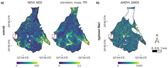 ΔNDVI and ΔNDII were moderately correlated (0.4 < ρ < 0.7) for Typhoons Herb, Nari, and Soudelor for the FEF, were strongly correlated (0.7 < ρ < 0.9) for Typhoon Soudelor within the FFDP and for Typhoon Dujuan for the FEF and were very-strongly correlated (ρ > 0.9) for Typhoon Dujuan for both the FFDP and the FEF. However, for Typhoon Aere, the correlation between the two VIs was weak (ρ = 0.05 and ρ = 0.28 in the FFDP and the FEF, respectively). Topographical variables were weakly, if ever, correlated with ΔVIs with absolute Spearman’s ρ always below 0.2 (e.g., for elevation).