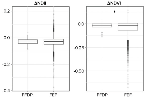 ΔNDII and ΔNDVI (calculated as the difference between post- and pre-disturbance values) for Typhoon Nari in the Fushan Forest Dynamics Plot (FFDP) and the Fushan Experimental Forest (FEF). Negative values indicate loss of vegetation. Significant differences between FFDP and FEF based on bootstrap comparison on means are shown with an asterisk (*).