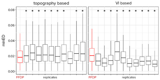 Minimal Euclidian distances (minED) measured between the Fushan Experimental Forest (FEF) and the Fushan Forest Dynamics Plot (FFDP) for the four-rectangles plot design strategy (all designs shown in Figure S4). Two types of minED were calculated: based on topographical variables (left panel), and based on vegetation indices (VI, right panel). Significant differences between the minED calculated for the FFDP and the alternative plots shown with an asterisk (*, see Table S5).
