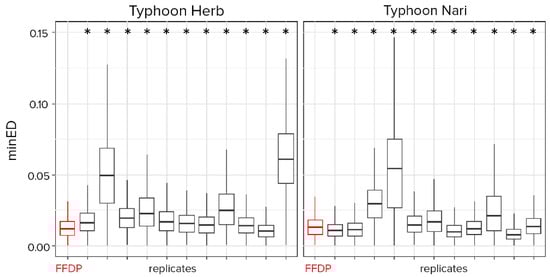 The FFDP had a lower mean minED than most of the alternative plot design strategies for Typhoons Dujuan, Herb, and Soudelor (Table S7). However, it was not the case for Typhoon Nari, wherein several alternative plot designs had smaller minEDs than the FFDP. See Figure 8 for Typhoons Herb and Nari for the four-rectangular design (other typhoons and plot designs shown in Figure S5).